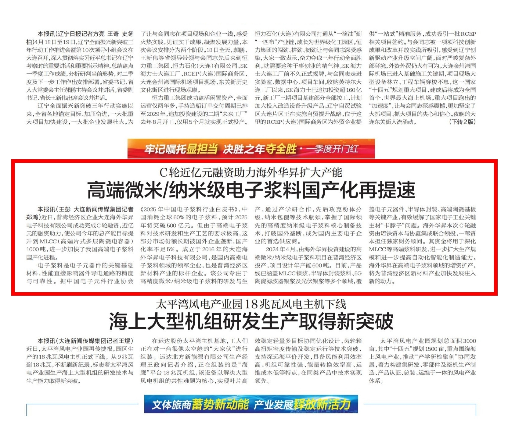 大連海外華昇電子科技有限公司(簡稱“海外華昇”)于2016年4月成立,注冊資本7940萬元,是一家專業(yè)從事高精度、微米/納米級電子漿料研發(fā)、生產(chǎn)和銷售的高新技術(shù)企業(yè)。目前,海外華昇已完成實際投資超2億元,建成大連總公司、無錫子公司、東莞分公司、上海子公司(上海正銀)、嘉興子公司(浙江納沛)、肇慶子公司、淮北子公司和日本子公司,擁有國際領(lǐng)先的電子漿料精益生產(chǎn)線,設(shè)備400臺(套),設(shè)計年產(chǎn)能1000噸,設(shè)計產(chǎn)值30億元。